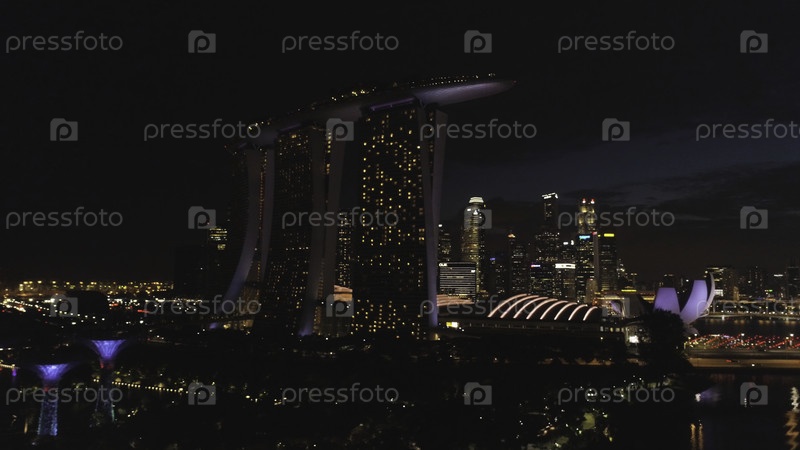 Вид с воздуха Сингапура ночью.Снимать.Вид на Сингапур ночью