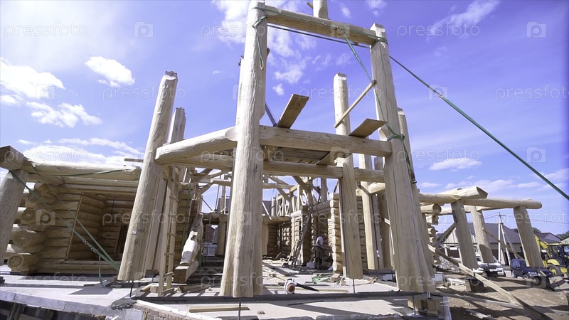 Красивый вид на строящийся деревянный дом.Первоначальное строительство деревянного дома на фоне синего неба.Рамка из древесных бревен дома