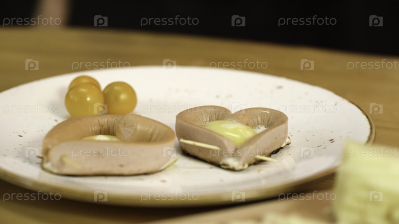 Близкий план на тарелке жареных яиц с сердечными колбасами. резервные кадры. романтический завтрак с яйцами в форме сердца для ваших близких