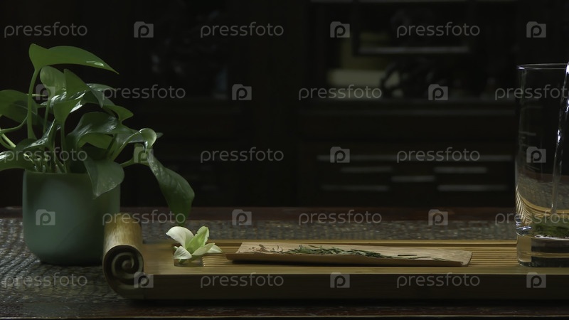 Чайная церемония.Женщина наливает горячую воду в чайник.Стеклянный чайник с цветущим чаецветком внутри 4K