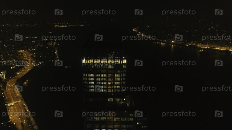 Вид на небоскреб в Гонконге ночью.Сток.Прекрасный вид высокого небоскреба в центральном деловом районе Гонконга