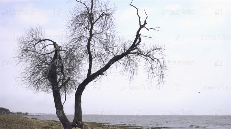 Одинокое старое дерево у моря.Снимки.Одинокий сухой ствол на пляже рядом с морем в депрессивный облачный и дождливый день