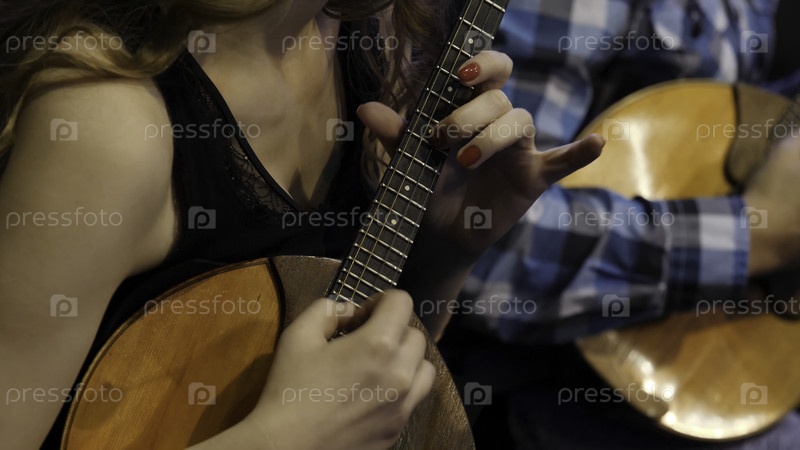 Женщина играет музыку с балалайкой. Понятие стиля жизни. Русский инструмент. Народная музыка русского ансамбля - женщина, играющая на балалайке