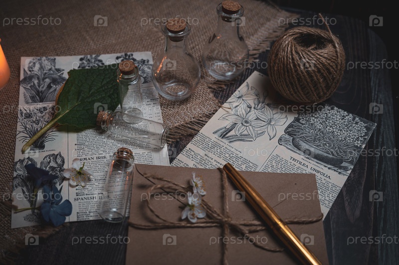 Мистический натюрморт в винтажном стиле с пустыми флаконами, письмами и отрывками из газет