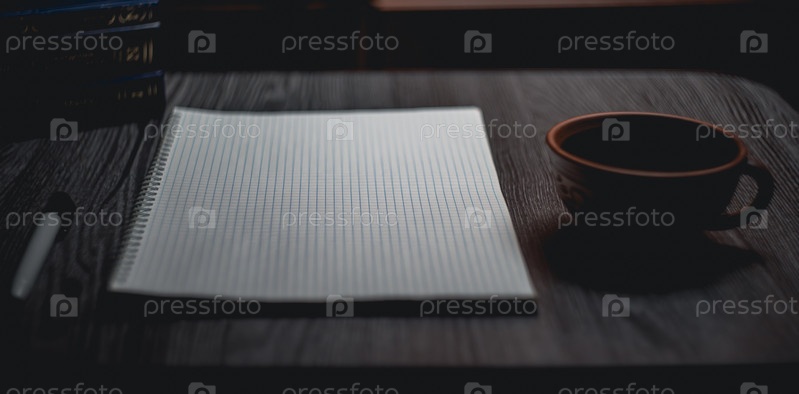 Рабочее место: блокнот с черным маркером и чашка для кофе на деревянном столе