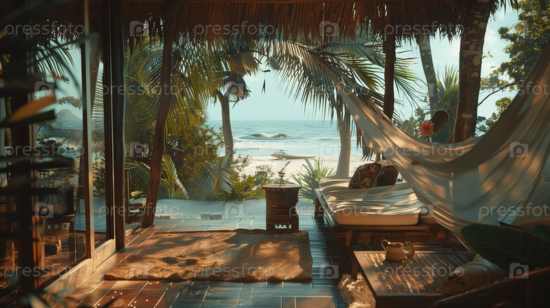 Красивая пляжная интерьерная сцена из роскошных номеров у моря.Отдых, отдых, природа