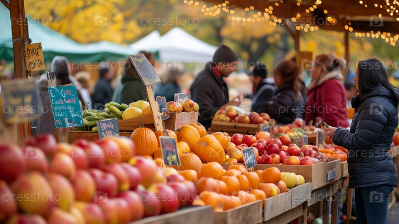 Люди покупают на оживленном открытом фермерском рынке осенью