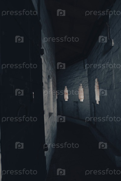 Слабо освещенный коридор с небольшими окнами в старом здании