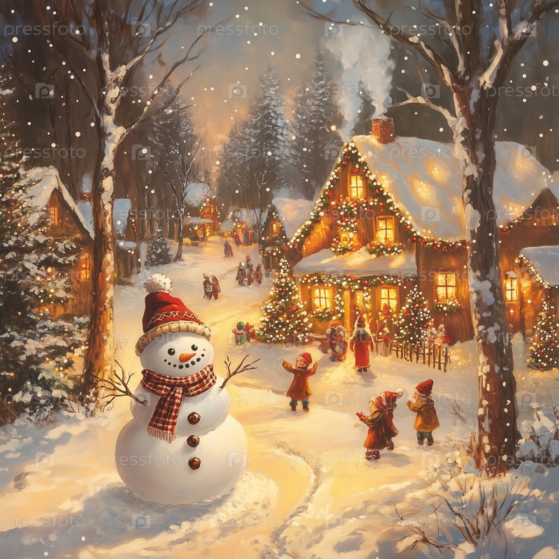 Снеговик в заснеженной деревне в Рождественский день