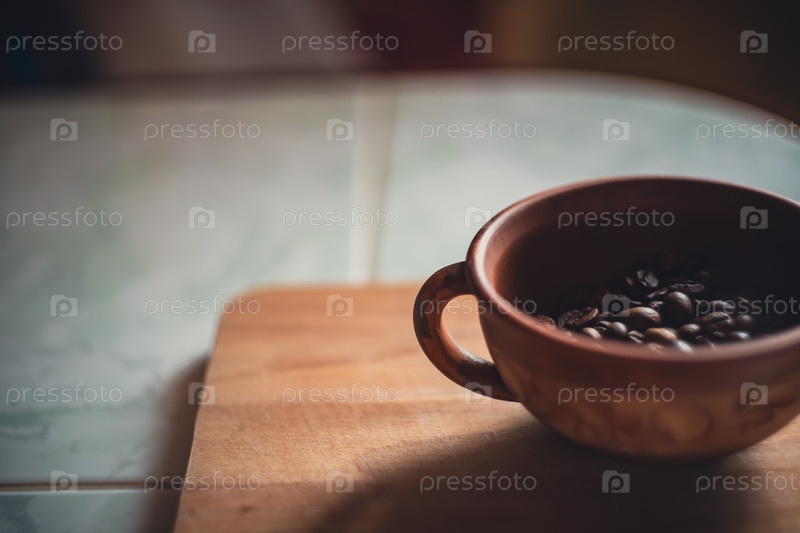 Кофейные бобы в глиняной чашке