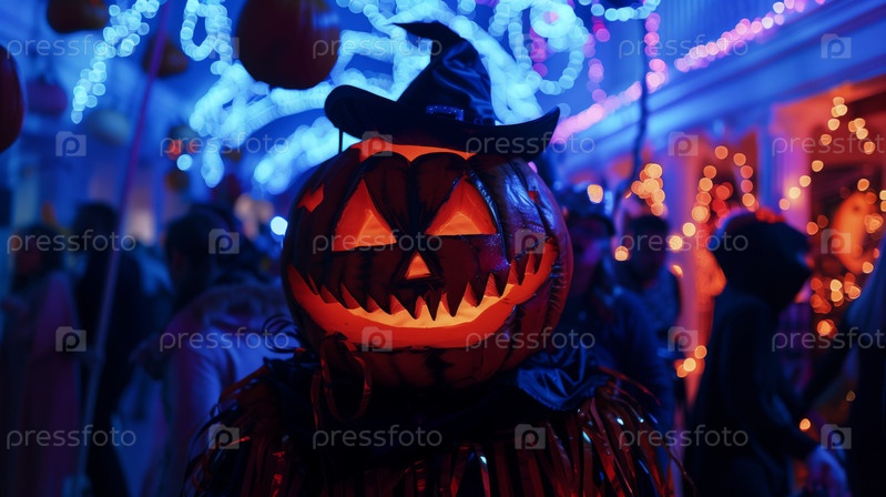 Хэллоуин с людьми в костюмах и тыквенными украшениями