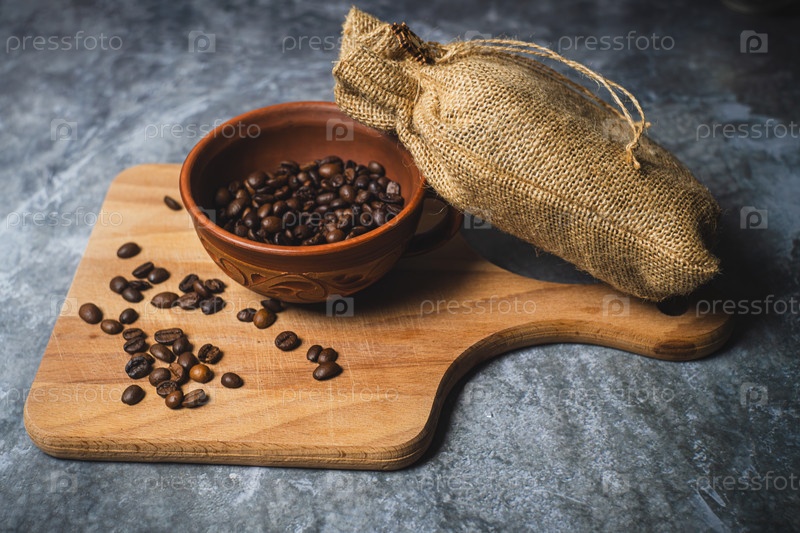 Кофейные бобы в глиняной чашке