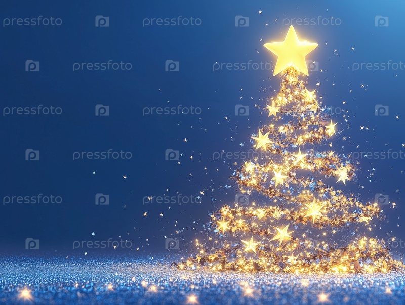 Блестящая рождественская елка со светящейся звездой на синем фоне