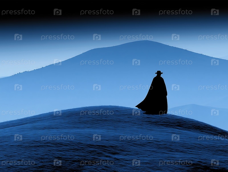 Одинокая фигура в плаще, стоящая на холме против туманного синего пейзажа