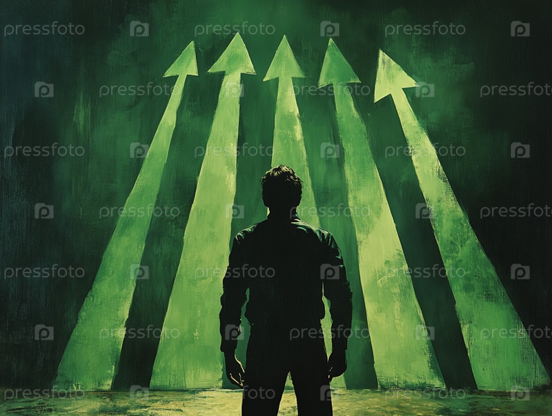 Человек стоит перед поднимающимися стрелками, символизирующими рост и прогресс