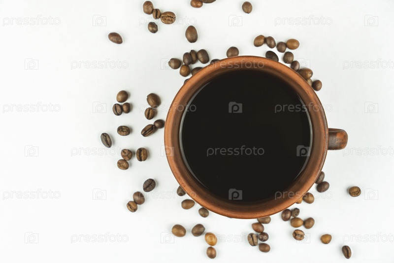 Чашка с рассеянными кофейными зернами на белом фоне