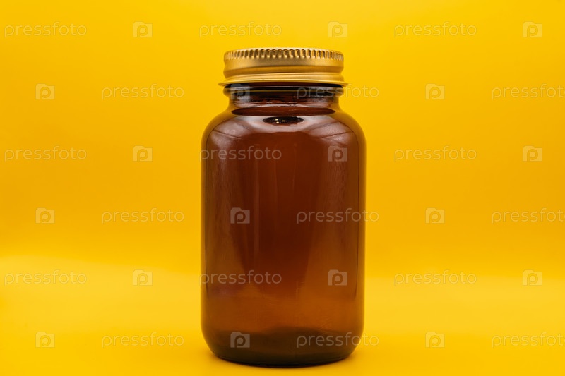 Янтарная стеклянная банка с золотой крышкой на желтом фоне