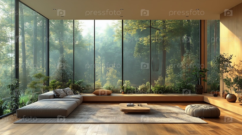 Современная гостиная с видом на лес и естественным светом