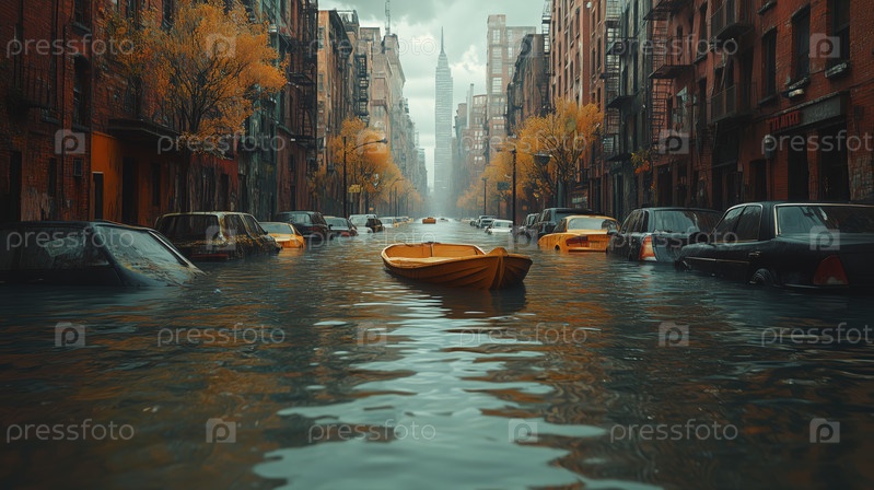Наводненная городская улица с заброшенными автомобилями и желтой гребной лодкой осенью