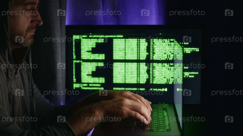 Хакер печатает на ноутбуке с зеленым кодом на экране, киберпреступность разворачивается в темной комнате с высокими ставками, напряжение захватывает зрителей, киберпреступная драма увлекает поиском интенсивных технических нарративов, хороших для рекламы,