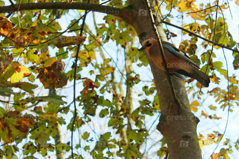 Джей на ветке осеннего дерева