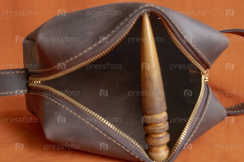 Внутренняя часть кожаной сумки, вид на застежку и сликер