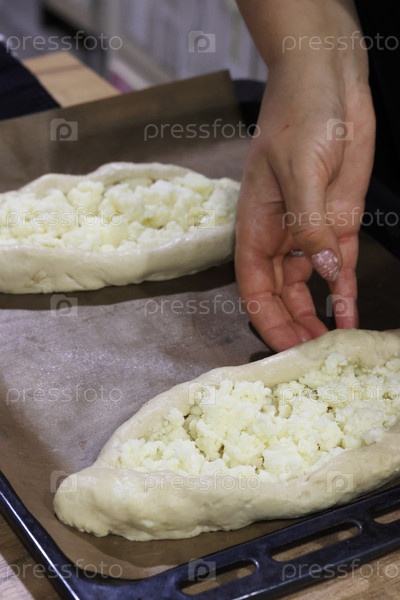 Приготовленные кусочки теста на подносе для выпечки, тесто в форме лодок, заполненное измельченным сыром сулугни, женщина готовит грузинское блюдо - хачапури