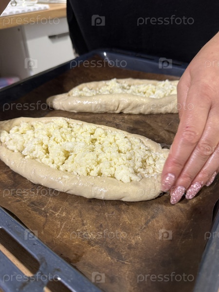 Дегу в форме лодки на тарелке для выпечки перед выпечкой, сверху которого измельченный сыр сулугни, приготовление блюда грузинской кухни хачапури