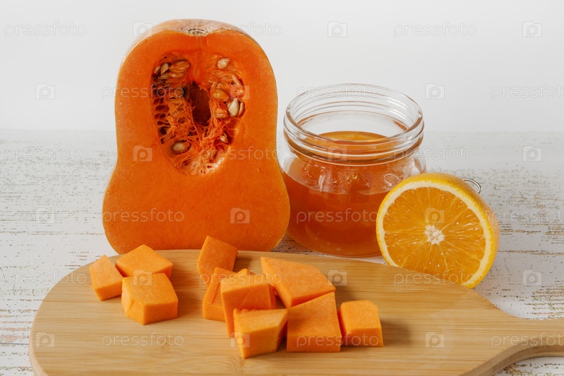 Сладкий тыквенно-оранжевый мармелад или конфигурация в маленькой банке с нарезанной тыквой на деревянном фоне