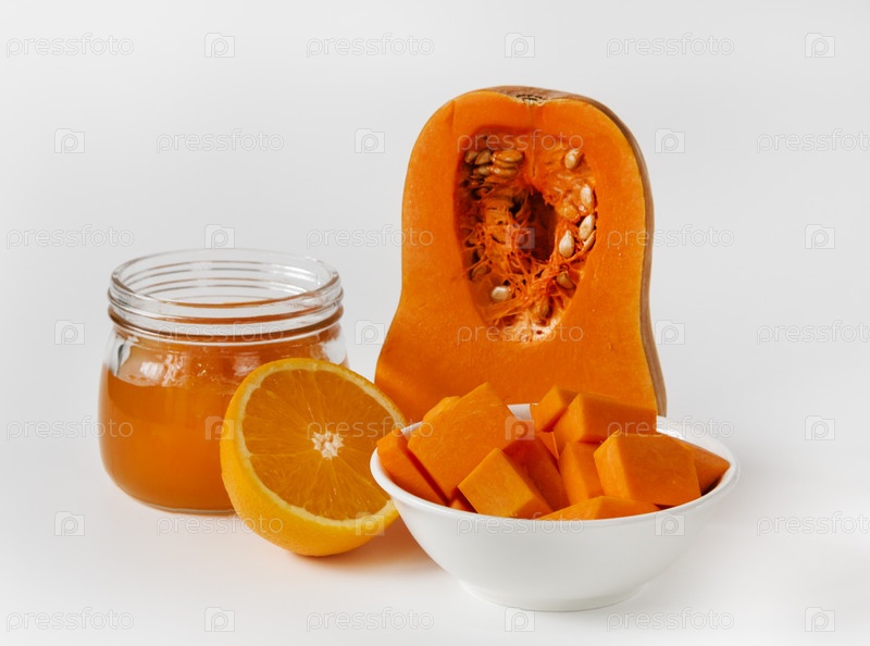 Сладкий тыквенно-оранжевый мармелад или конфигурация в маленькой банке с нарезанной тыквой на белом фоне