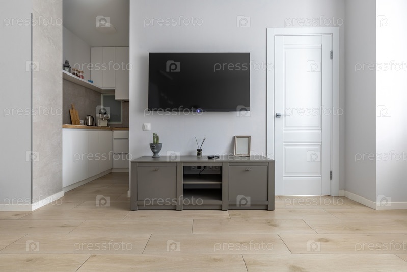 Яркая современная гостиная с стеновым телевизором, серым гардеробом и открытой минималистической кухней, создавая чистый, стильный и уютный интерьер квартиры
