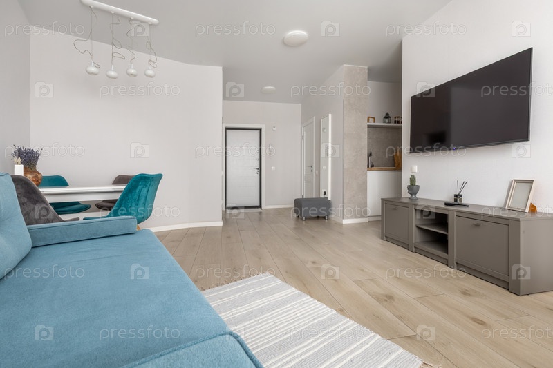 Современный яркий интерьер гостиной с голубым диваном, стеновым телевизором, столовой и минималистическим дизайном кухни создает уютную и просторную домашнюю атмосферу