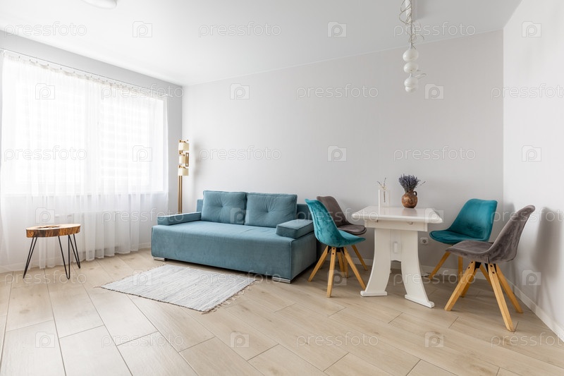 Яркая минималистическая гостиная с синим диваном и обеденным столом