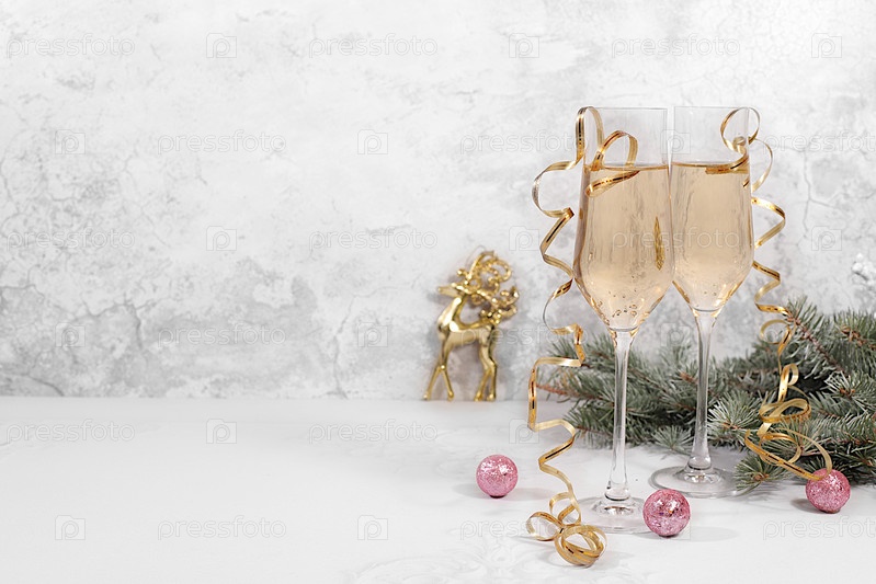 Два бокала шампанского на элегантном праздничном фоне с финиковыми ветвями и украшениями, концепция в канун Рождества. Рождественская и новогодняя компоновка для дизайна продукта и демонстрации. Счастливого Нового года