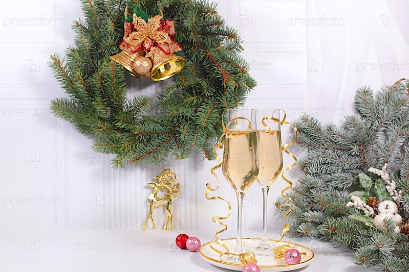 Два бокала шампанского на элегантном праздничном фоне с финиковыми ветвями и украшениями, концепция в канун Рождества. Рождественская и новогодняя компоновка для дизайна продукта и демонстрации. Счастливого Нового года