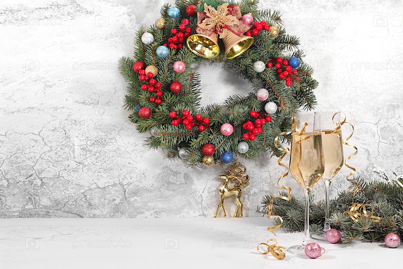С Новым годом.Два бокала шампанского на праздничном фоне смоковниц и украшений, концепция канун Рождества.Рождественская и новогодняя компоновка для дизайна и продаж