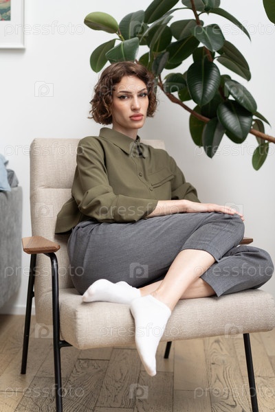 Красивая молодая женщина позирует в зеленой рубашке в студии, сидящая