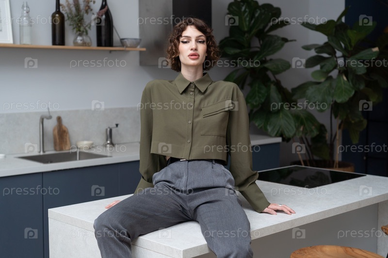 Красивая молодая женщина позирует в зеленой рубашке в студии, сидящая