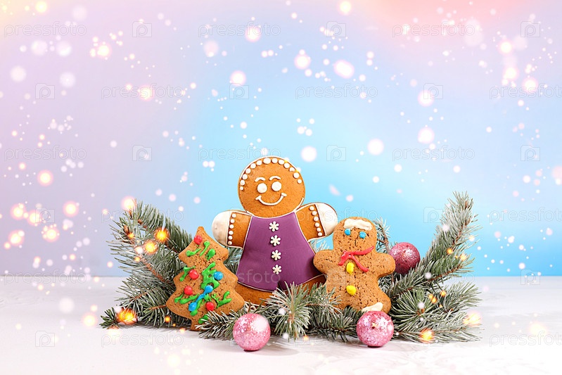 Праздничные зимние поздравительные открытки, имбирный торт и рождественские украшения на заснеженных ветвях сосны, концепция канун Рождества, новогодний фон с огнями и декорациями