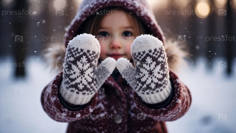 Маленький ребенок в вязаных перчатках гуляет на улице зимой