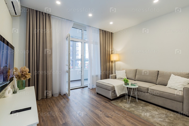 Яркая современная гостиная в бежевых цветах с диваном и выходом на балкон