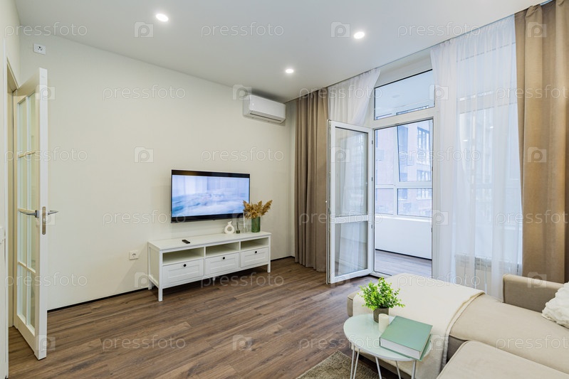 Современный яркий интерьер гостиной с телевизором и открытым балконом