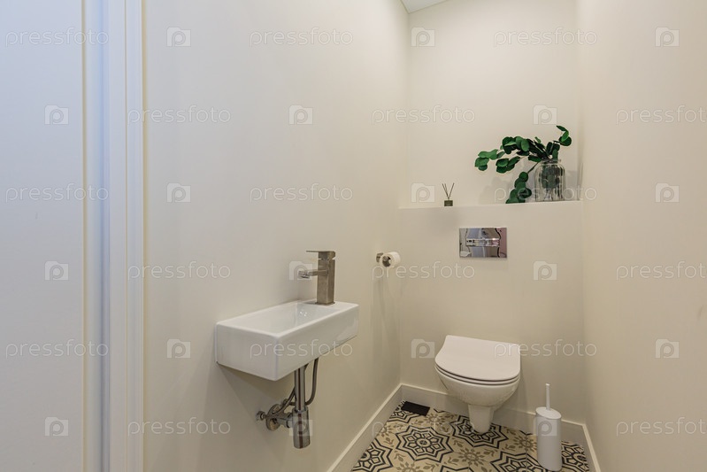 Небольшой современный туалет с подвесным унитазом, раковиной и декоративным полом