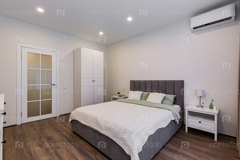 Современная спальня с двуспальной кроватью, гардеробом и белой дверью