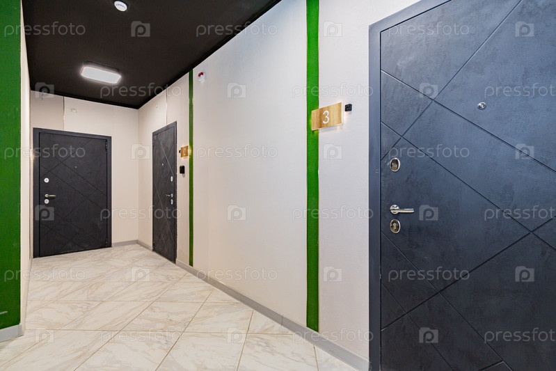 Современный вход или коридор жилого здания с черными дверями и контрастной отделкой
