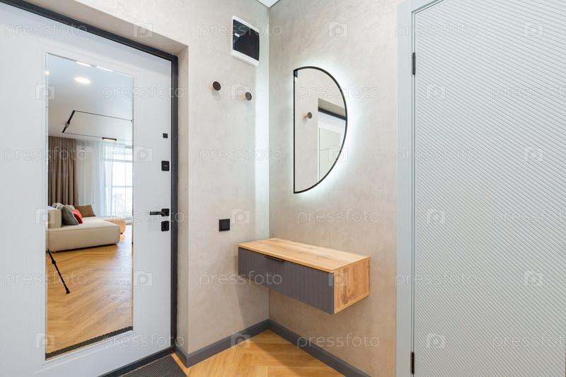 Стильный коридор с полукруглым зеркалом со светом, подвешенной консолью и видом на гостиную