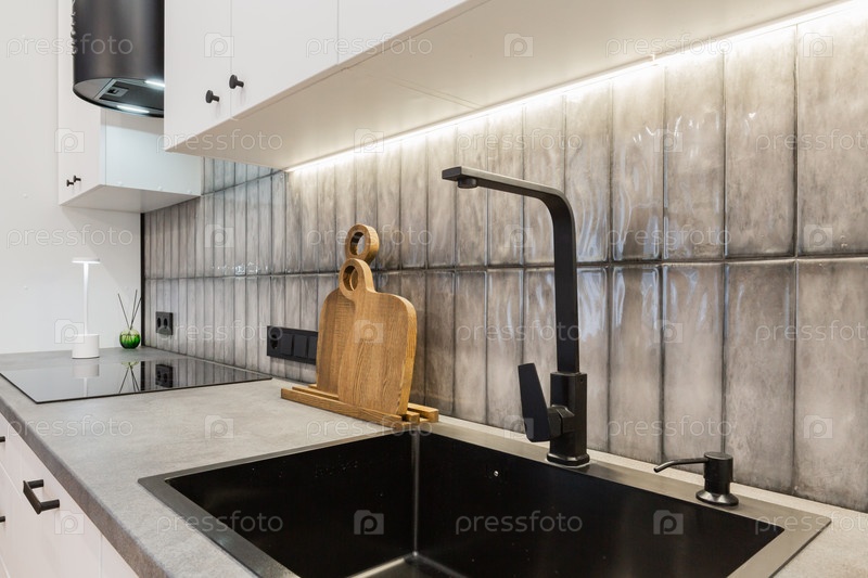Близкий план черного квадратного раковины и миксера на современной кухне с текстурированным серым фартуком