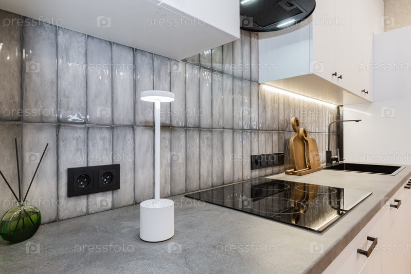 Современный кухонный фартук из глянцевой серой плитки с индукционной печью и минималистическим декором
