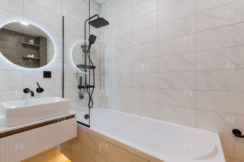 Современная белоснежная ванная комната с ванной, раковиной и системой черного душа