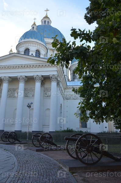 Модели турецких пушек вокруг колонны славы в Тринити-Измайловском соборе (Святая Троица Измайловский собор, Собор Святой Жизни-Гвардейцев из Izmailovo полка) храм православного имперского стиля в Санкт-Петербурге на солнечном дне
